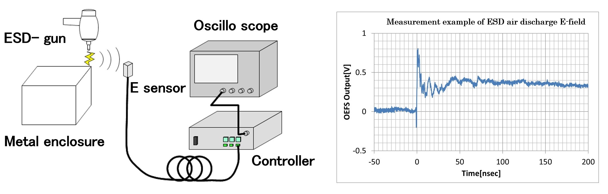 It is an “OPTICAL PROBE” that accurately measures the noise electric field and voltage which causes malfunction such as ESD by optical technology without using metal coaxial wire. Since “OPTICAL PROBE” is electrically isolated from the object to be measured, there is no fear that an expensive measuring instrument such as an oscilloscope will be destroyed and safe measurement is possible.