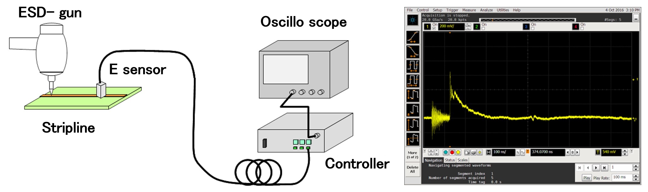 ② Indirect measurement of ESD voltage on stripline with E sensor.